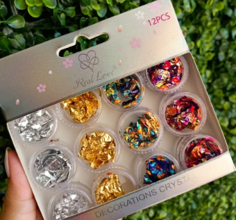 Kit 12 potinhos folha de ouro para decoração de unhas.